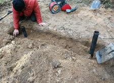 На данном участке изначально присутствовал только простой бетонный памятник и металлическое ограждение. Нам же необходимо было привести территорию могилы в полный порядок. Приступая к работе, мы первым делом вкручиваем определяющие фундамент сваи.